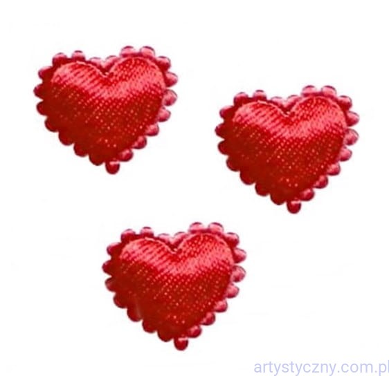 Atłasowe aplikacje, mini serduszka z falbanką, wypełnione cienką gąbką, dzięki czemu są przestrzenne.
