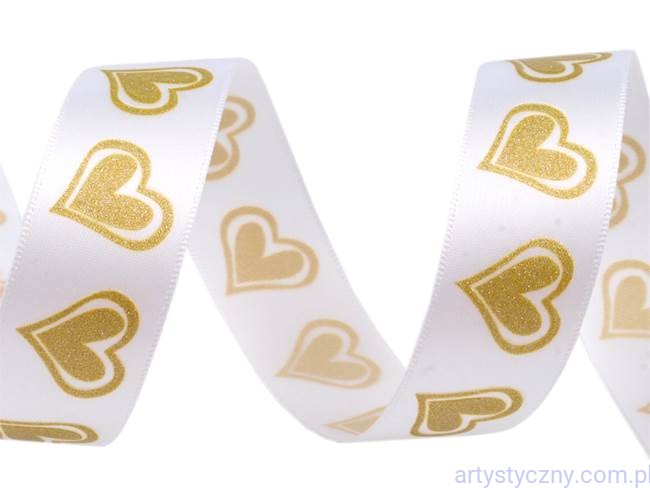 tasiemka satynowa w kolorze białym w złote brokatowe serduszka, o szerokości 22 mm, zamawiasz 2 metry