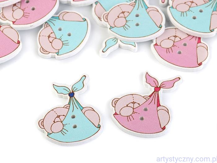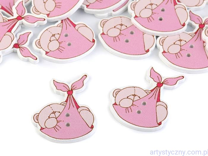 Są symbolem urodzenia dziecka. Można nimi ozdobić kartki okolicznościowe, pamiętniki, książki, ramki na zdjęcia i wiele innych przedmiotów. Oczywiście można ich użyć jako dekoracyjnych guzików, gdyż są to drewniane guziki.. Nadruk jest jednostronny, ozdoby są lakierowane, z drugiej strony są białe. Nie zaleca się ich prać.