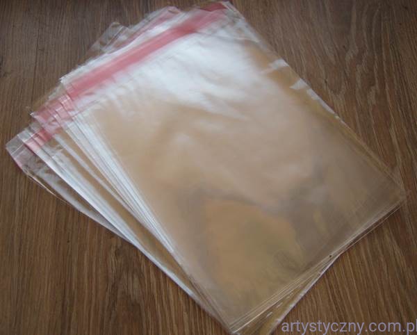 Woreczki foliowe z krystalicznego celofanu, stosowane jako opakowania na koperty i kartki, zamykane paskiem klejącym