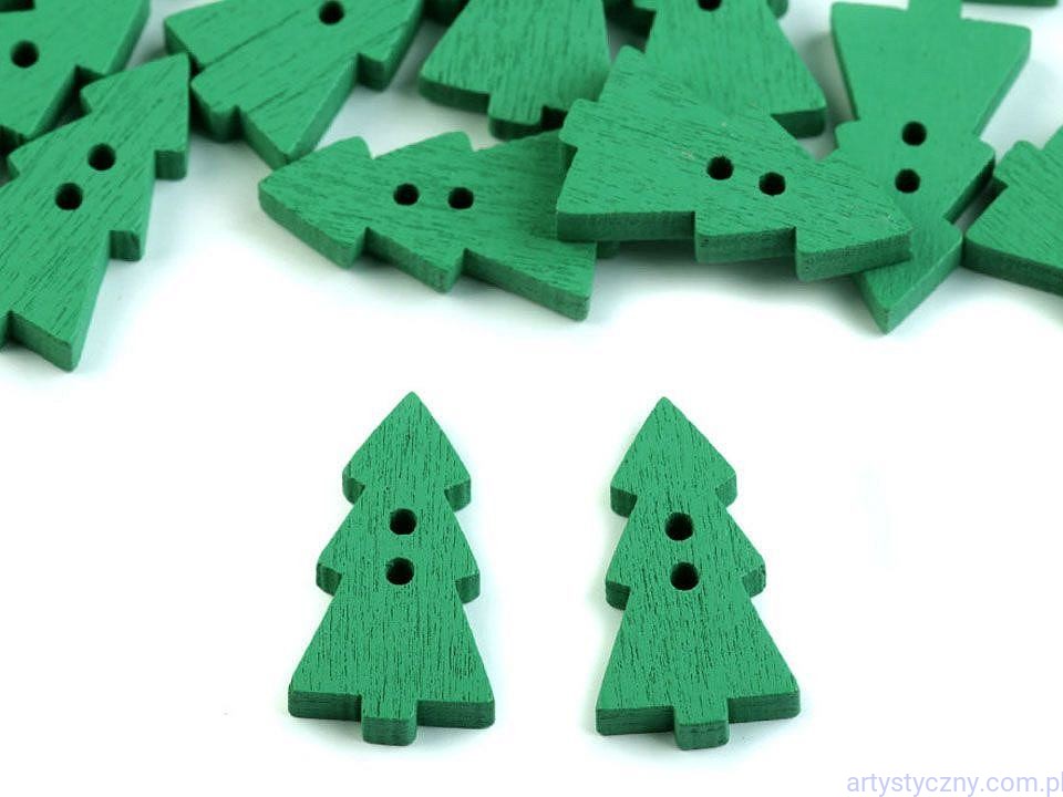 Drewniane guziki z dwoma dziurkami w kształcie choinek. Użyjesz ich w scrapbookingu, do ozdabiania ramek, kartek, winietek, zaproszeń, pamiętników itp. Nie zaleca się ich prać.