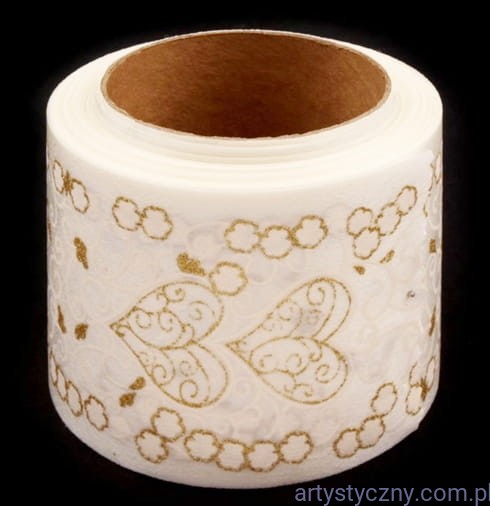 Wstążka o bardzo luksusowym oraz romantycznym charakterze. Ozdabia ją nadruk ornamentów i serc z błyszczącym brokatem.