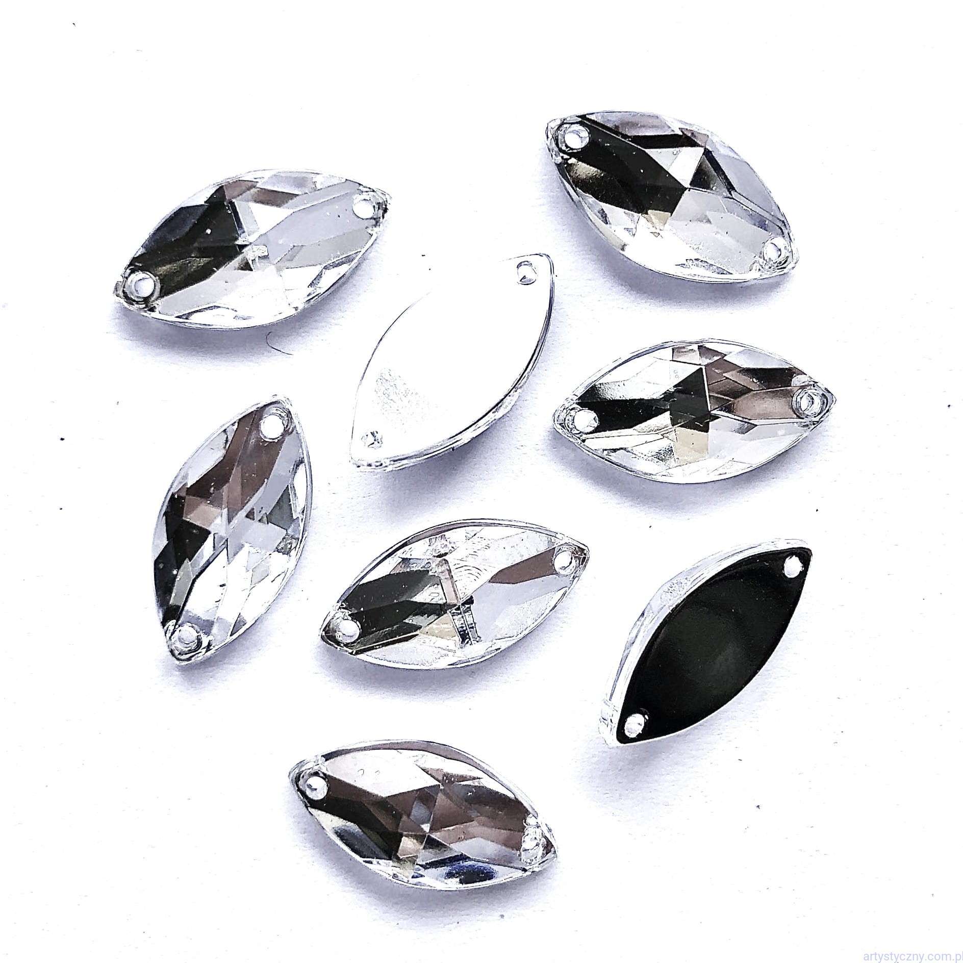 Precyzyjnie oszlifowane kamienie efektownie się błyszczą. Kamienie mają kształt łezki. W każdym kamieniu są dwa otwory, które umożliwiają łatwe naszycie. Od spodu są pokryte farbą kryjącą, która chroni przed zabarwieniem materiału podkładowego. Kamieni można użyć do wyrobu szytej biżuterii czy ozdabiania odzieży. Doskonale wyróżnią się na sukienkach, bluzkach i dodatkach jak torebki, kapelusze itp.