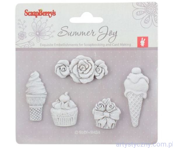 Zestaw 5 pięknych ozdób wykonanych z tworzywa sztucznego o wymiarach od ok. 1,9 x 2,4 cm (babeczka), do 2 x 4,2 cm (lód)